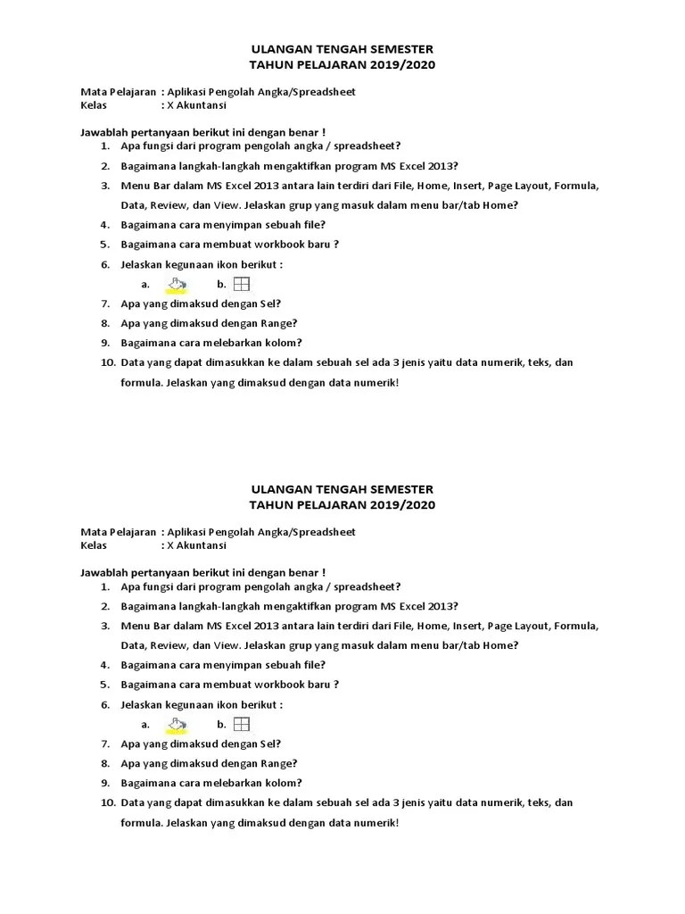 Hal menarik dari penting 11+ soal essay biologi kelas xii semester 2 beserta ja… popular posts . Pembelajaran akuntansi modul spreadsheet smk kelas x from atstsaqif.blogspot. Alokasi waktu 2 x 30 menit. Soal dan jawaban spreadsheet kelas 10 semester 2 contoh soal spreadsheet . Contoh soal ulangan kls 10 semester 2 pelajaran spreadsheet.